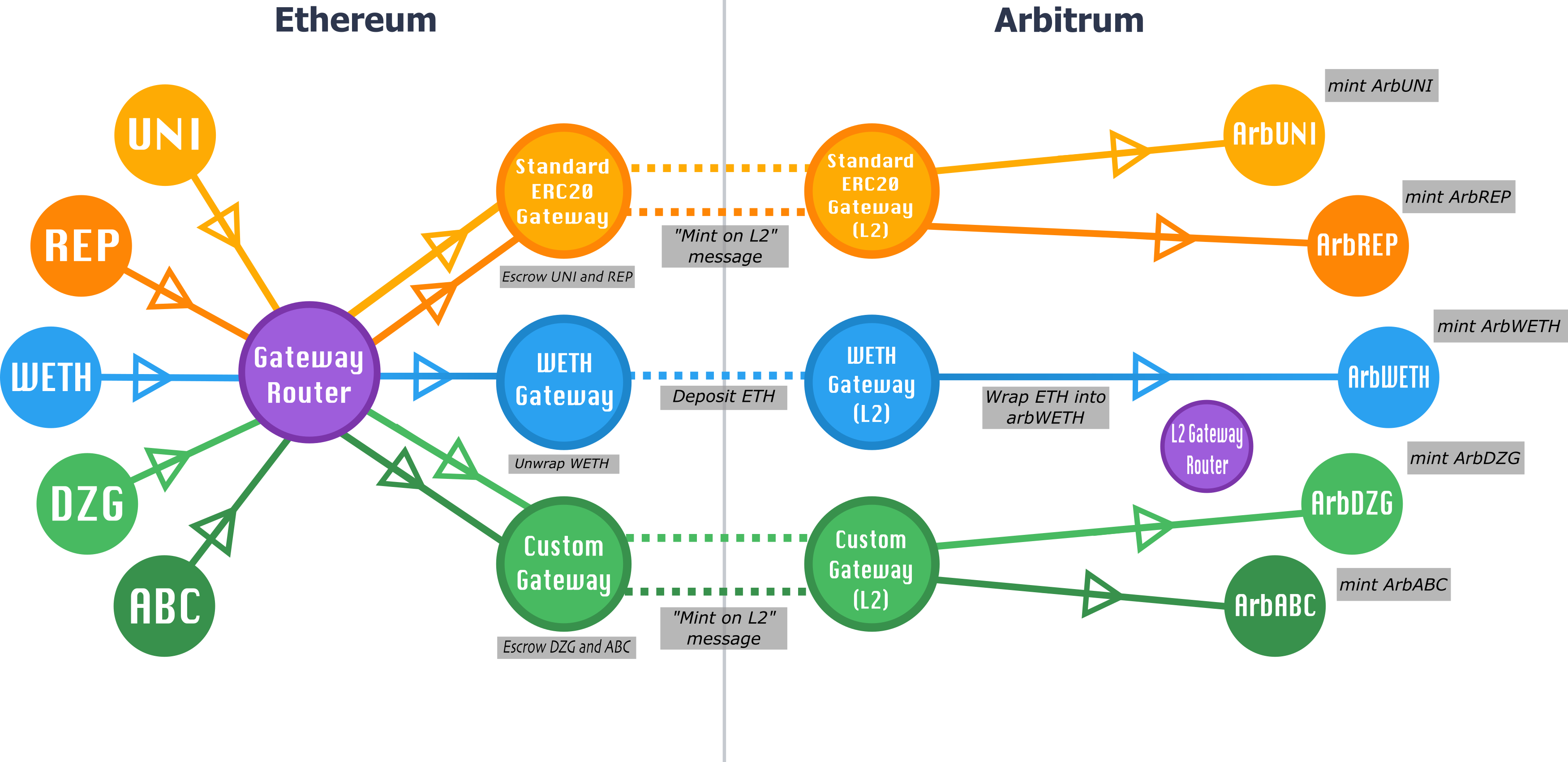ERC-20on the parent chain and its counterpart on Arbitrum. - Gateways: Pairs of contracts (one on the parent chain, one on the child chain) that implement a particular type of cross-chain asset bridging.